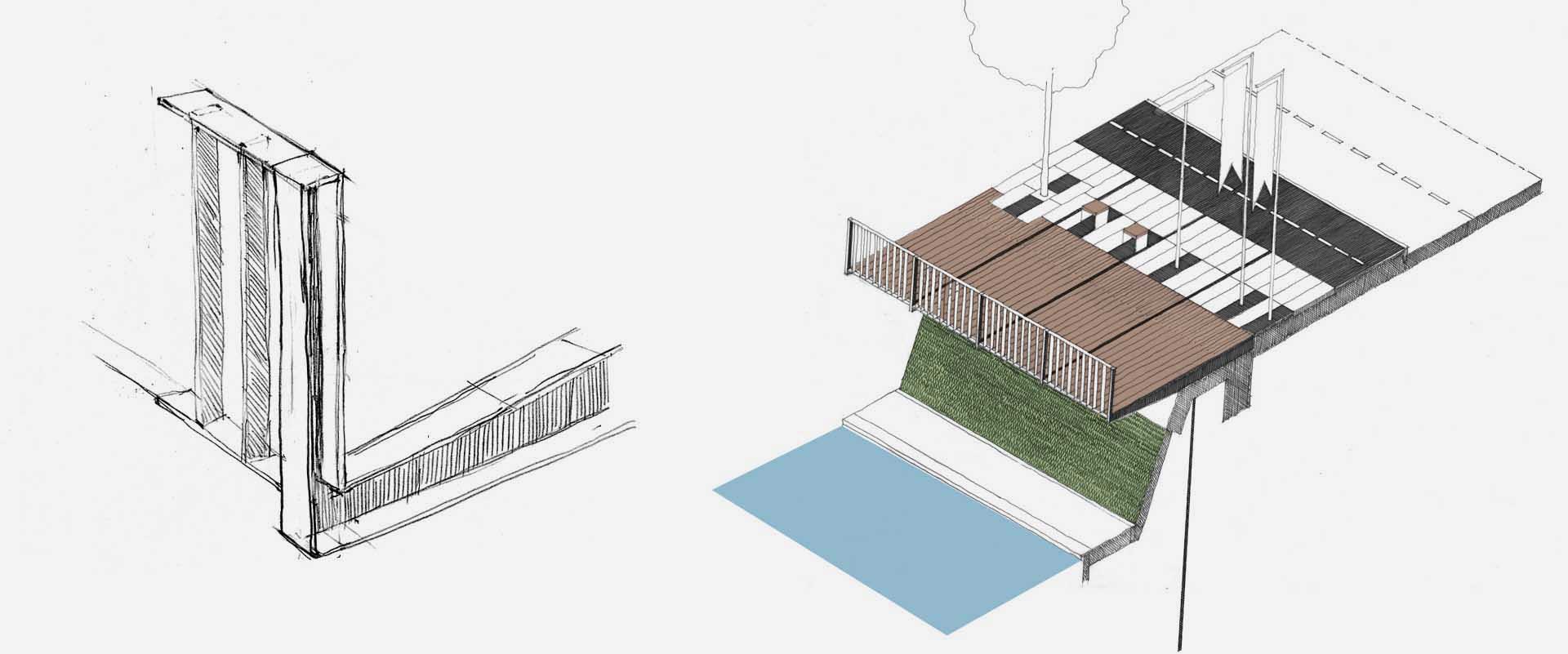 Dès les premières esquisses, le projet s’est voulu ambitieux, avec comme idée principale de réaliser un balcon en surplomb de l’Oise. Cette idée a séduit tous les acteurs du projet: le balcon allait donner à la ville une façade sur son fleuve, face au Fort de Cergy, et un espace public contemporain, fonctionnel et ludique à la fois.