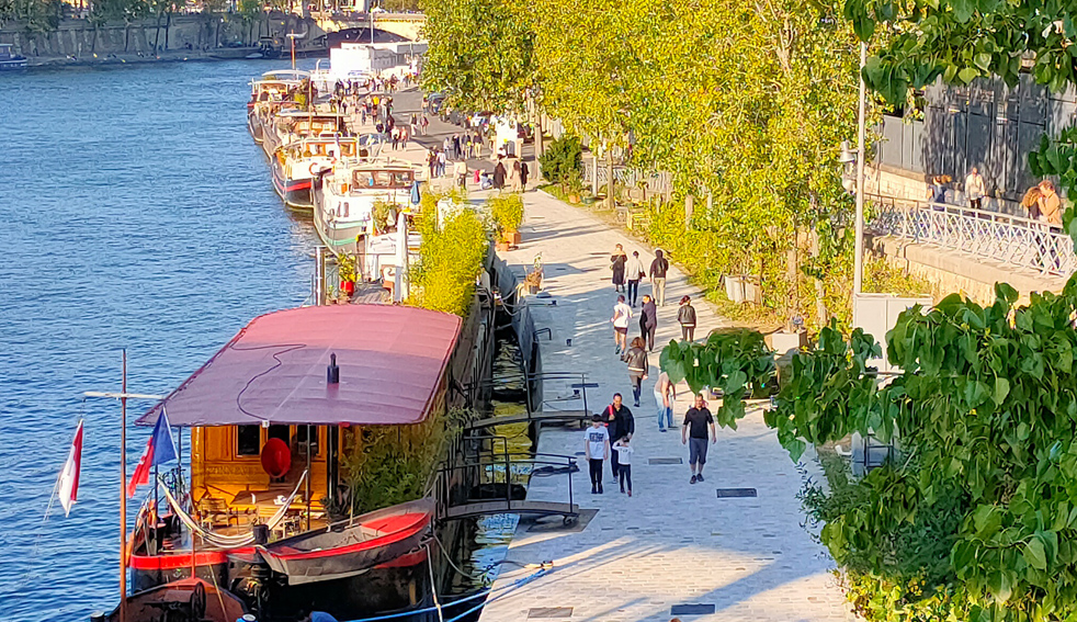 Le port dans la partie aval est une véritable attraction touristique avec ses bateaux logements accostés le long de la berge. En fond de quai les habitants cultivent des jardins d’ornement. Ici on retrouve une ambiance de Paris d’antan, une balade plantée avec un sol clair en pavés de grès.